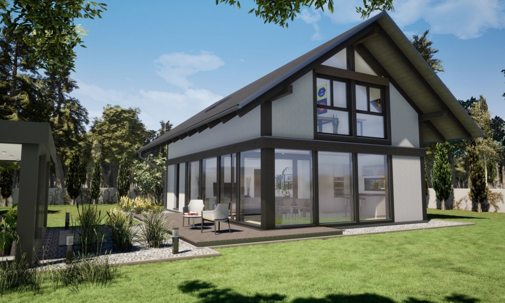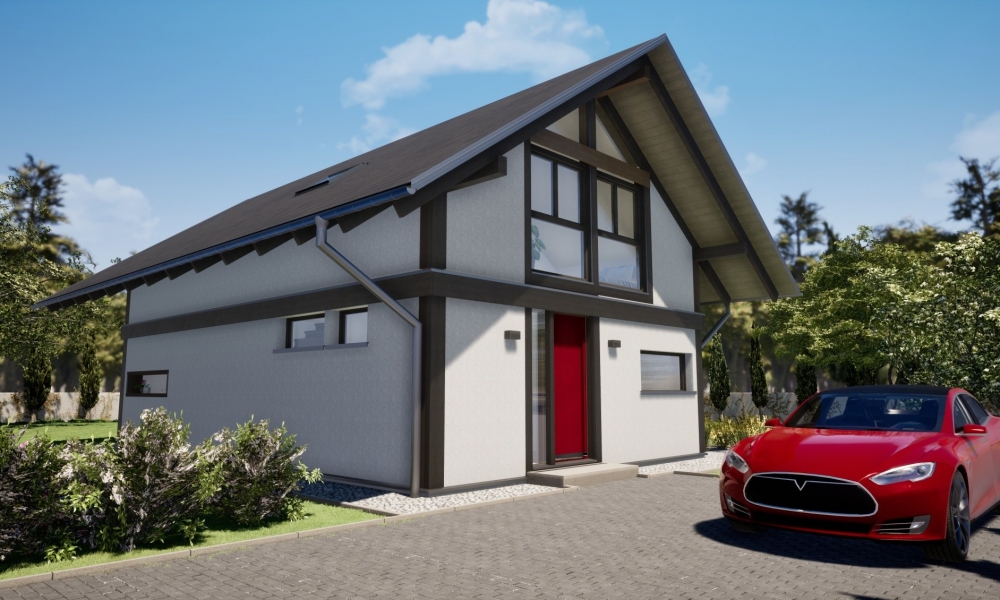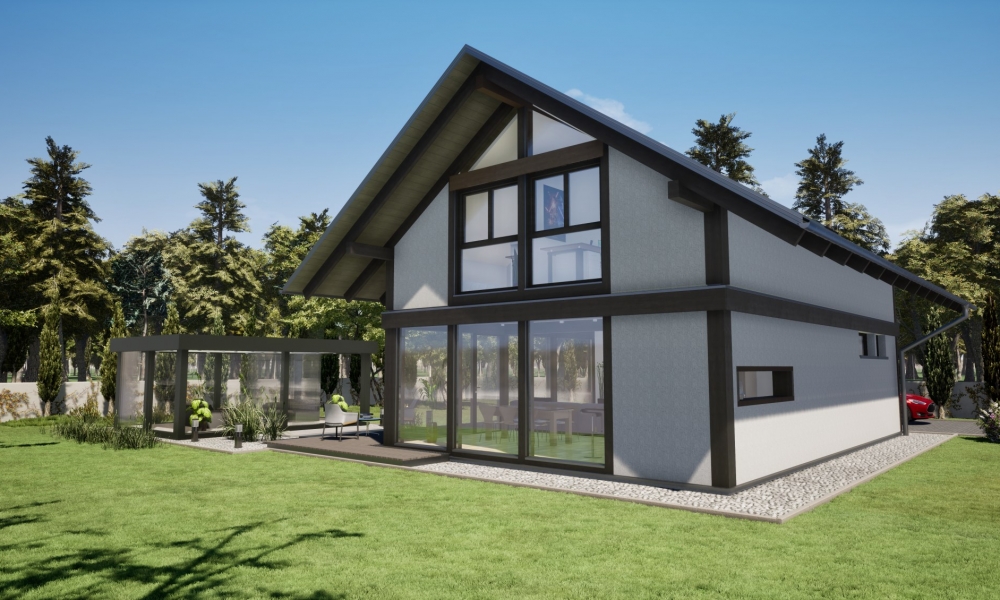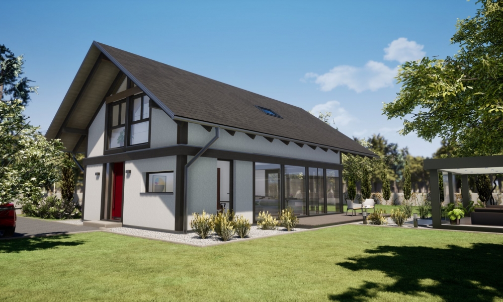 En su versión básica, el VITA NOVA Classic 140 le ofrece una entrada desde la fachada frontal, junto a la cual se distribuye despacho o habitación y un baño. El espacio para la sala técnica y su despensa se encuentran bajo una escalera cerrada, y el salón se abre completamente al entorno.