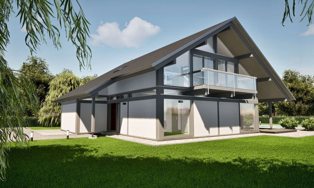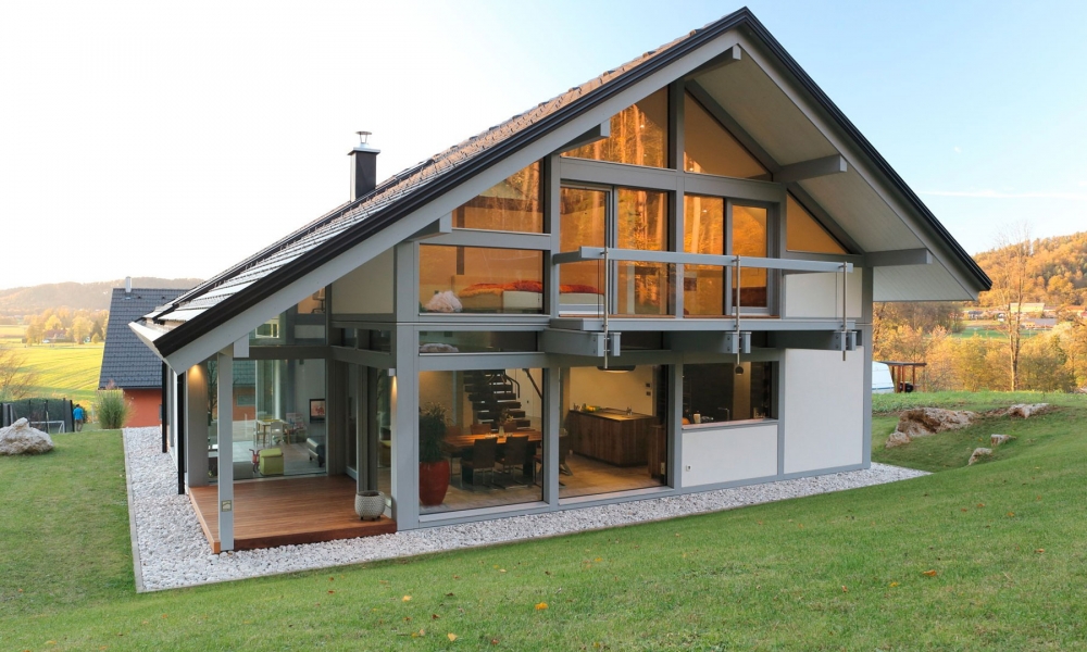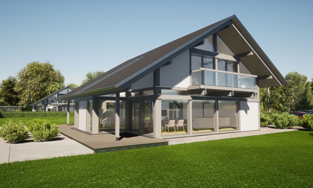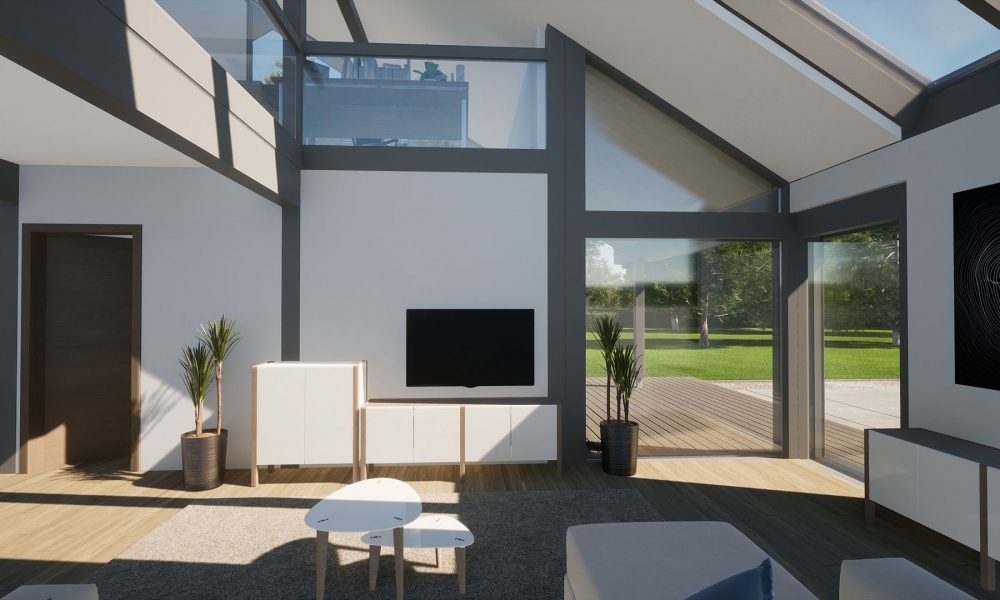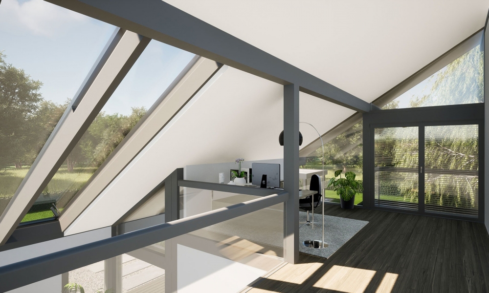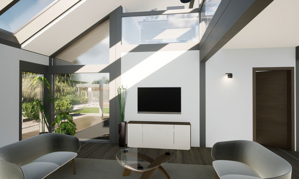 VITA NOVA Edition 219 está diseñada con una entrada desde el lado norte, a través del vestíbulo de entrada se accede a la sala de estar abierta con comedor y cocina. En la planta baja también ubicamos el dormitorio principal y el baño, al que se accede a través del vestidor. La planta superior con tres habitaciones idénticas y el baño se comunica con la inferior a través de un estudio abierto, que también dispone de una gran franja de techo de cristal.