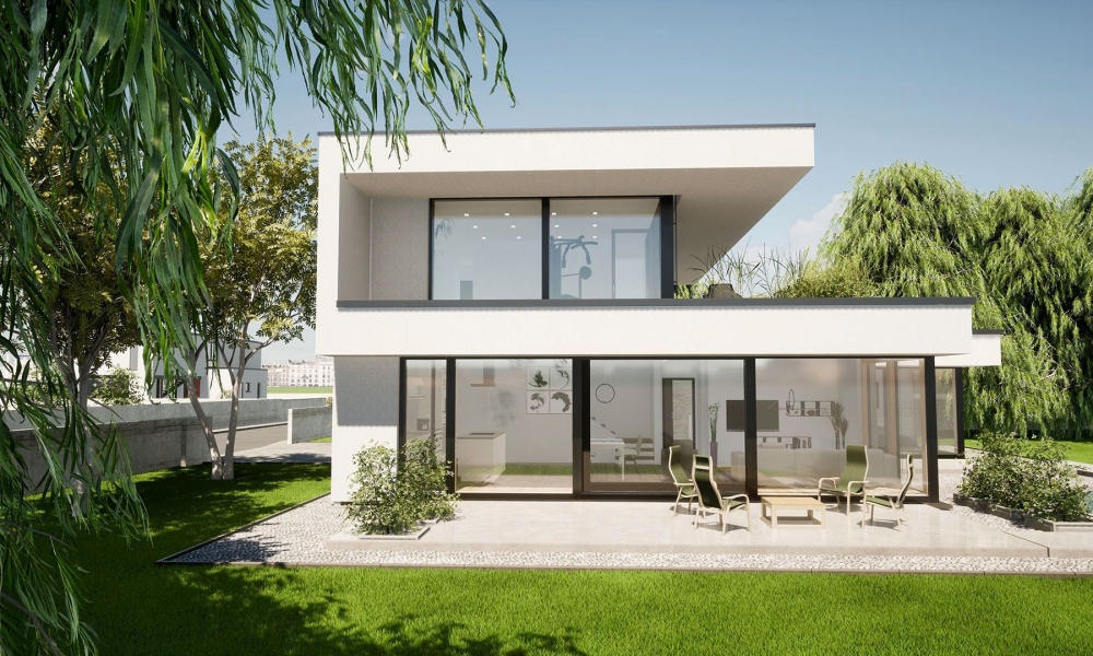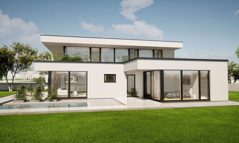 El diseño conceptual de VITA NOVA Modern 233 es un excelente punto de partida para cualquiera que quiera una casa moderna con muchas superficies de vidrio. Su diseño representa una sala de estar abierta con comedor y cocina y un dormitorio con vestidor y baño en la planta baja. Arriba hay dos habitaciones para niños, un baño y una sala de fitness. Debido al mayor volumen inferior, se forma una gran terraza en el primer piso.